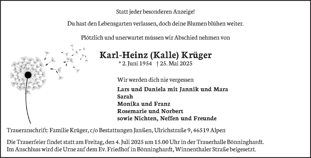 Hier finden Sie alle Traueranzeigen aus der Zeitung, die bisher für Karl-Heinz Krüger erschienen sind. Weitere Traueranzeigen, die in der Zeitung erscheinen, werden hier ebenfalls aufgelistet
