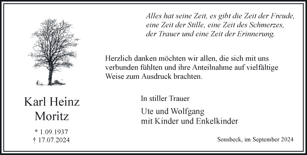 Hier finden Sie alle Traueranzeigen aus der Zeitung, die bisher für Karl Heinz Moritz erschienen sind. Weitere Traueranzeigen, die in der Zeitung erscheinen, werden hier ebenfalls aufgelistet