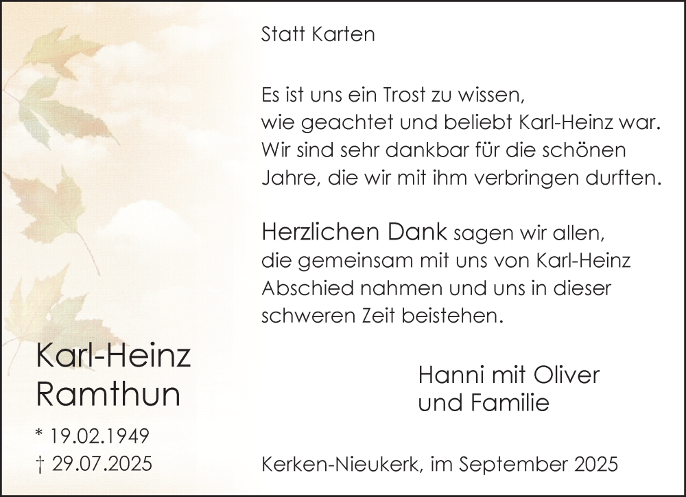 Hier finden Sie alle Traueranzeigen aus der Zeitung, die bisher für Karl-Heinz Ramthun erschienen sind. Weitere Traueranzeigen, die in der Zeitung erscheinen, werden hier ebenfalls aufgelistet