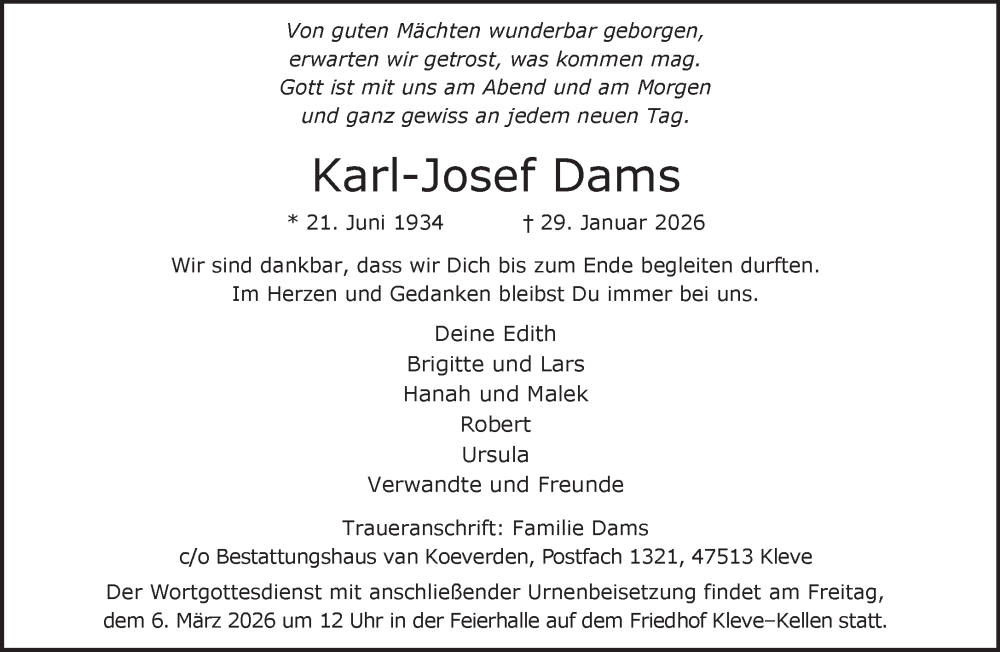 Hier finden Sie alle Traueranzeigen aus der Zeitung, die bisher für Karl-Josef Dams erschienen sind. Weitere Traueranzeigen, die in der Zeitung erscheinen, werden hier ebenfalls aufgelistet