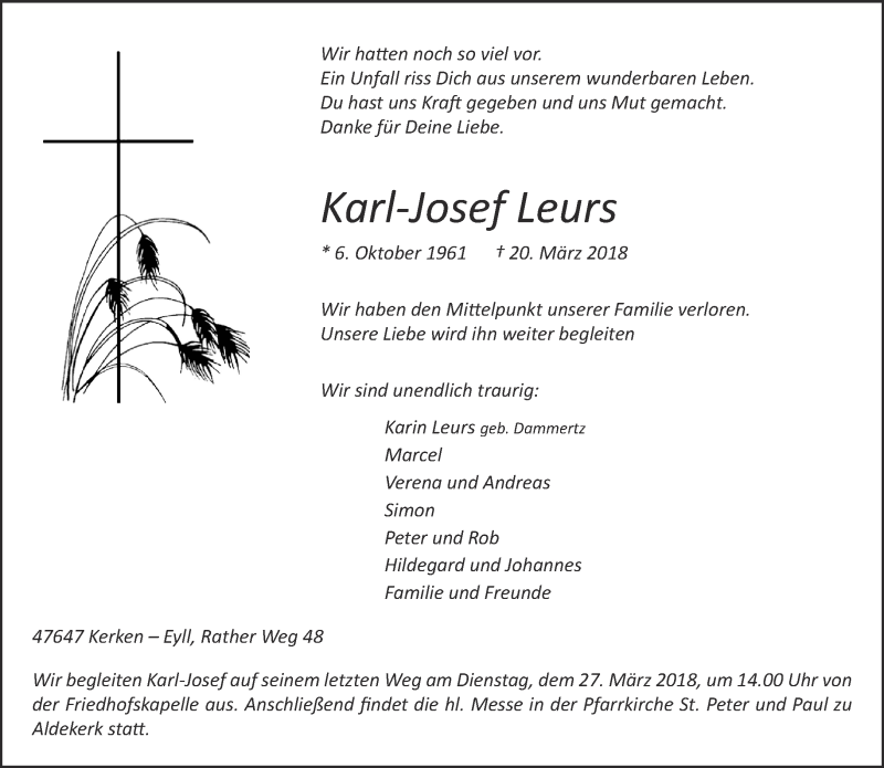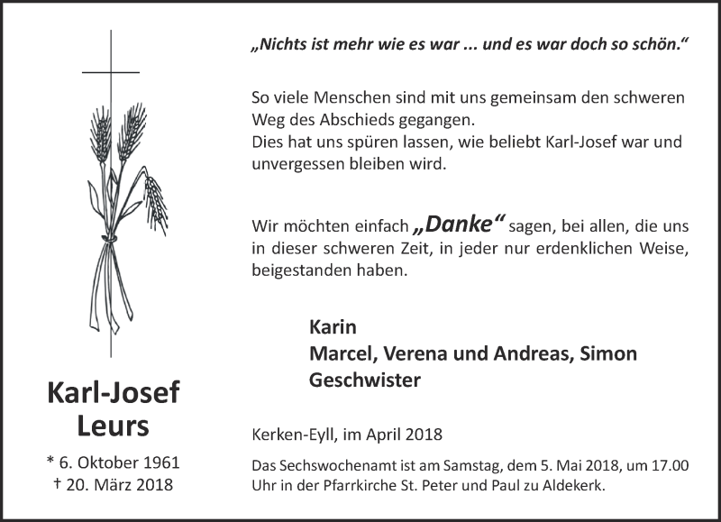 Hier finden Sie alle Traueranzeigen aus der Zeitung, die bisher für Karl-Josef Leurs erschienen sind. Weitere Traueranzeigen, die in der Zeitung erscheinen, werden hier ebenfalls aufgelistet