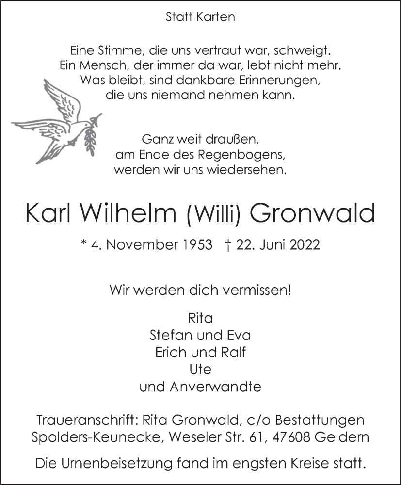 Hier finden Sie alle Traueranzeigen aus der Zeitung, die bisher für Karl Wilhelm Gronwald erschienen sind. Weitere Traueranzeigen, die in der Zeitung erscheinen, werden hier ebenfalls aufgelistet