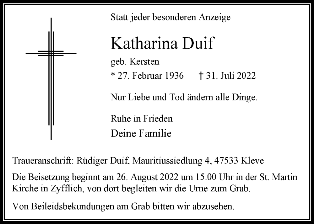 Hier finden Sie alle Traueranzeigen aus der Zeitung, die bisher für Katharina Duif erschienen sind. Weitere Traueranzeigen, die in der Zeitung erscheinen, werden hier ebenfalls aufgelistet