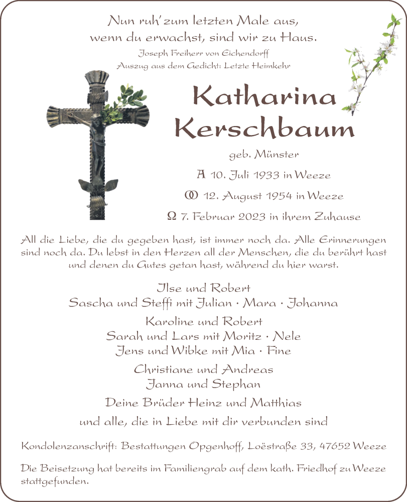 Hier finden Sie alle Traueranzeigen aus der Zeitung, die bisher für Katharina Kerschbaum erschienen sind. Weitere Traueranzeigen, die in der Zeitung erscheinen, werden hier ebenfalls aufgelistet