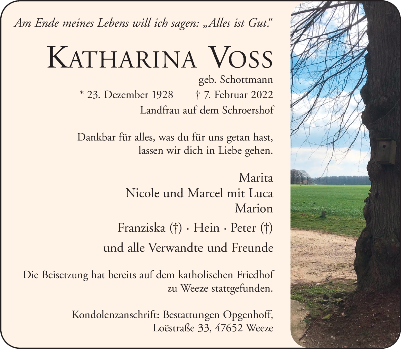Hier finden Sie alle Traueranzeigen aus der Zeitung, die bisher für Katharina Voss erschienen sind. Weitere Traueranzeigen, die in der Zeitung erscheinen, werden hier ebenfalls aufgelistet