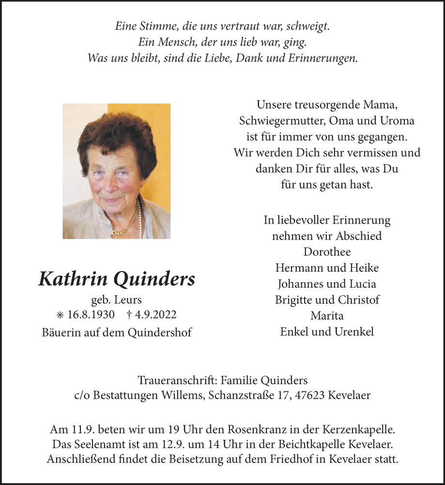 Hier finden Sie alle Traueranzeigen aus der Zeitung, die bisher für Kathrin Quinders erschienen sind. Weitere Traueranzeigen, die in der Zeitung erscheinen, werden hier ebenfalls aufgelistet