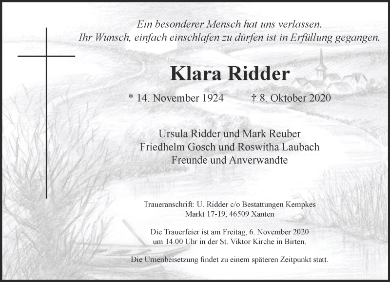 Hier finden Sie alle Traueranzeigen aus der Zeitung, die bisher für Klara Ridder erschienen sind. Weitere Traueranzeigen, die in der Zeitung erscheinen, werden hier ebenfalls aufgelistet