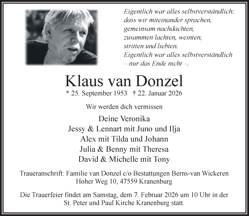 Hier finden Sie alle Traueranzeigen aus der Zeitung, die bisher für Klaus van Donzel erschienen sind. Weitere Traueranzeigen, die in der Zeitung erscheinen, werden hier ebenfalls aufgelistet