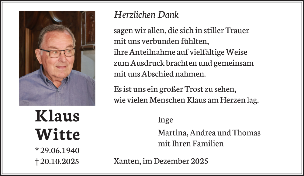 Hier finden Sie alle Traueranzeigen aus der Zeitung, die bisher für Klaus Witte erschienen sind. Weitere Traueranzeigen, die in der Zeitung erscheinen, werden hier ebenfalls aufgelistet