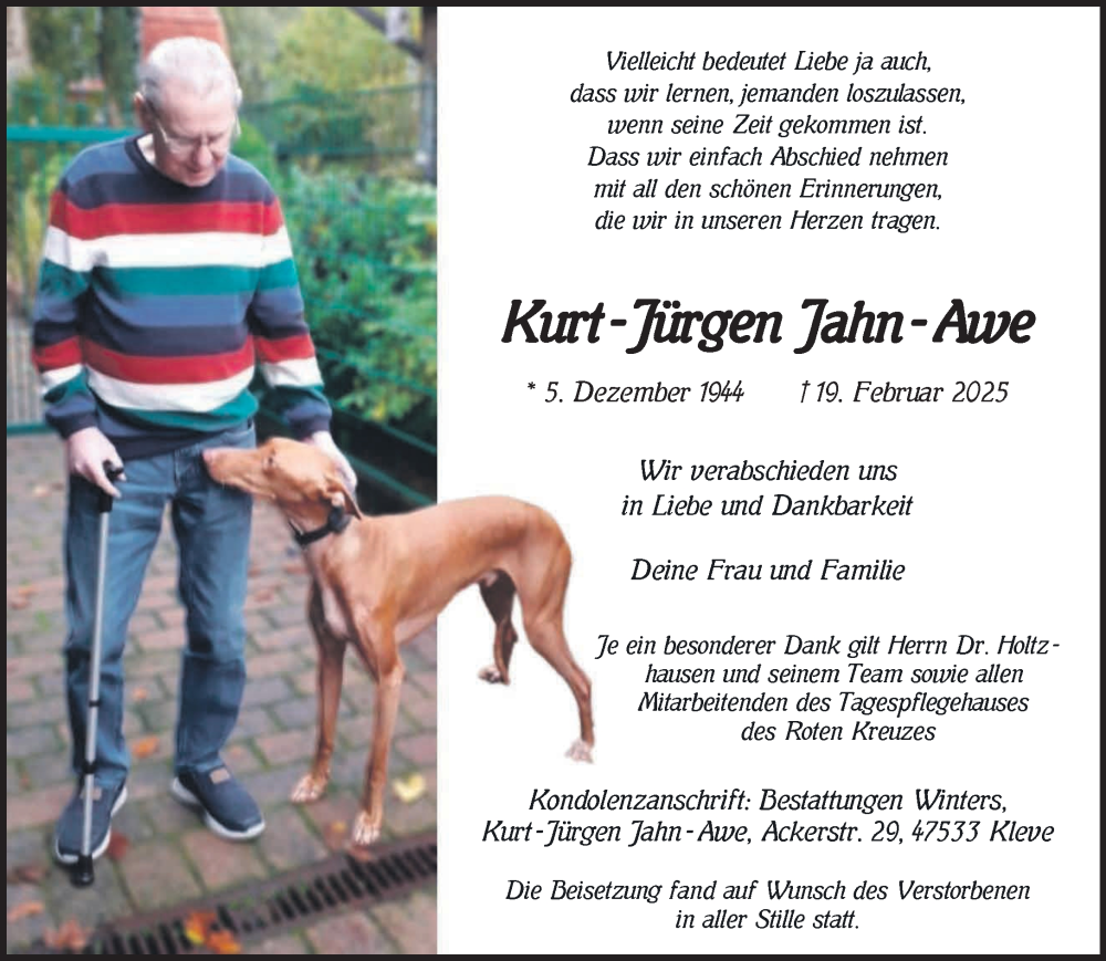 Hier finden Sie alle Traueranzeigen aus der Zeitung, die bisher für Kurt-Jürgen Jahn-Awe erschienen sind. Weitere Traueranzeigen, die in der Zeitung erscheinen, werden hier ebenfalls aufgelistet