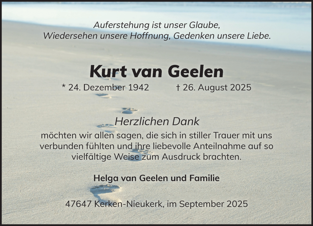 Hier finden Sie alle Traueranzeigen aus der Zeitung, die bisher für Kurt van Geelen erschienen sind. Weitere Traueranzeigen, die in der Zeitung erscheinen, werden hier ebenfalls aufgelistet