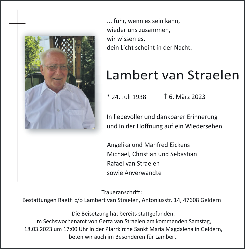 Hier finden Sie alle Traueranzeigen aus der Zeitung, die bisher für Lambert van Straelen erschienen sind. Weitere Traueranzeigen, die in der Zeitung erscheinen, werden hier ebenfalls aufgelistet