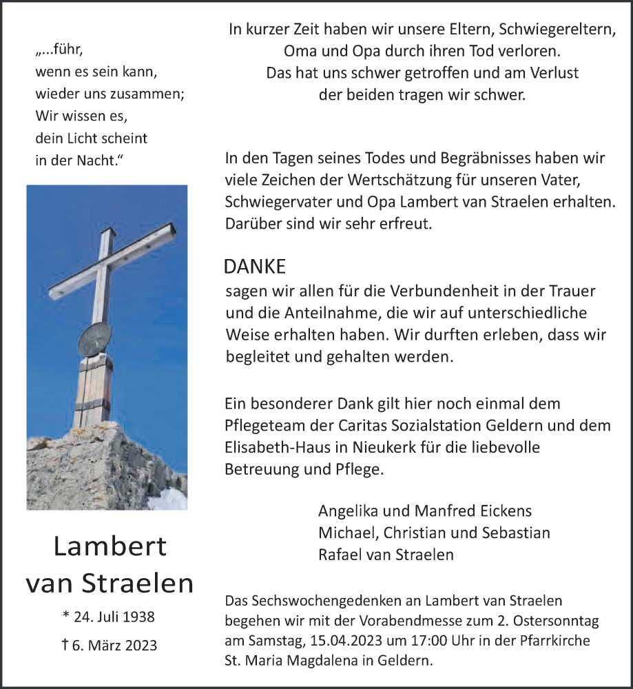 Hier finden Sie alle Traueranzeigen aus der Zeitung, die bisher für Lamert van Straelen erschienen sind. Weitere Traueranzeigen, die in der Zeitung erscheinen, werden hier ebenfalls aufgelistet