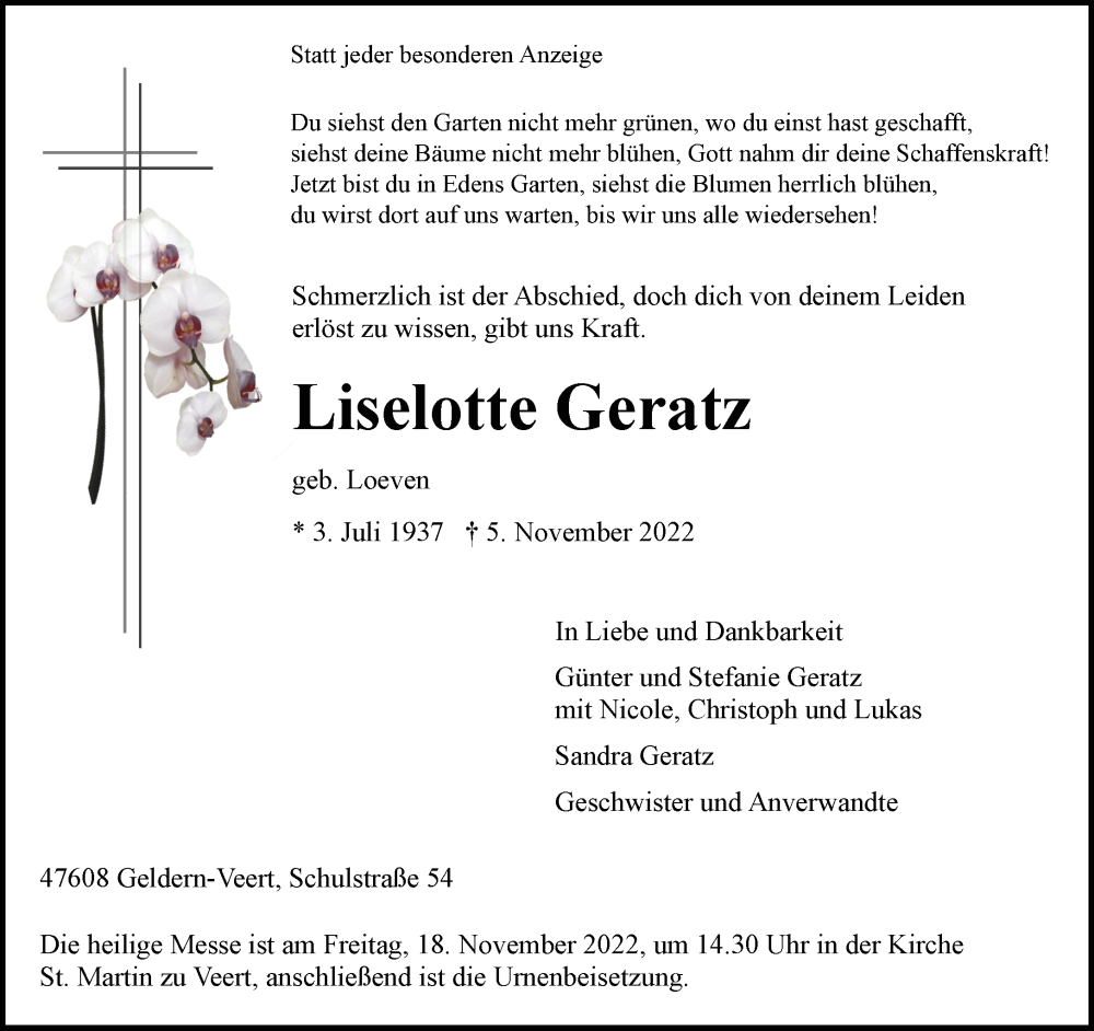 Hier finden Sie alle Traueranzeigen aus der Zeitung, die bisher für Liselotte Geratz erschienen sind. Weitere Traueranzeigen, die in der Zeitung erscheinen, werden hier ebenfalls aufgelistet