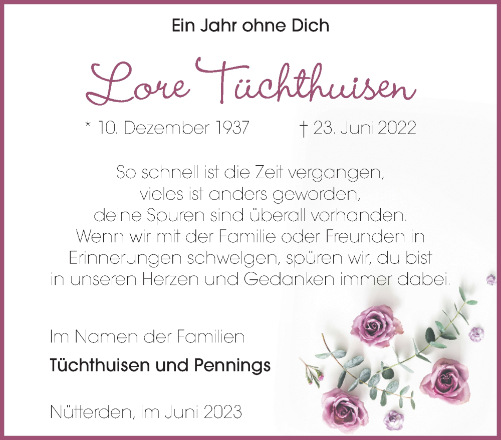 Hier finden Sie alle Traueranzeigen aus der Zeitung, die bisher für Lore Tüchthuisen erschienen sind. Weitere Traueranzeigen, die in der Zeitung erscheinen, werden hier ebenfalls aufgelistet