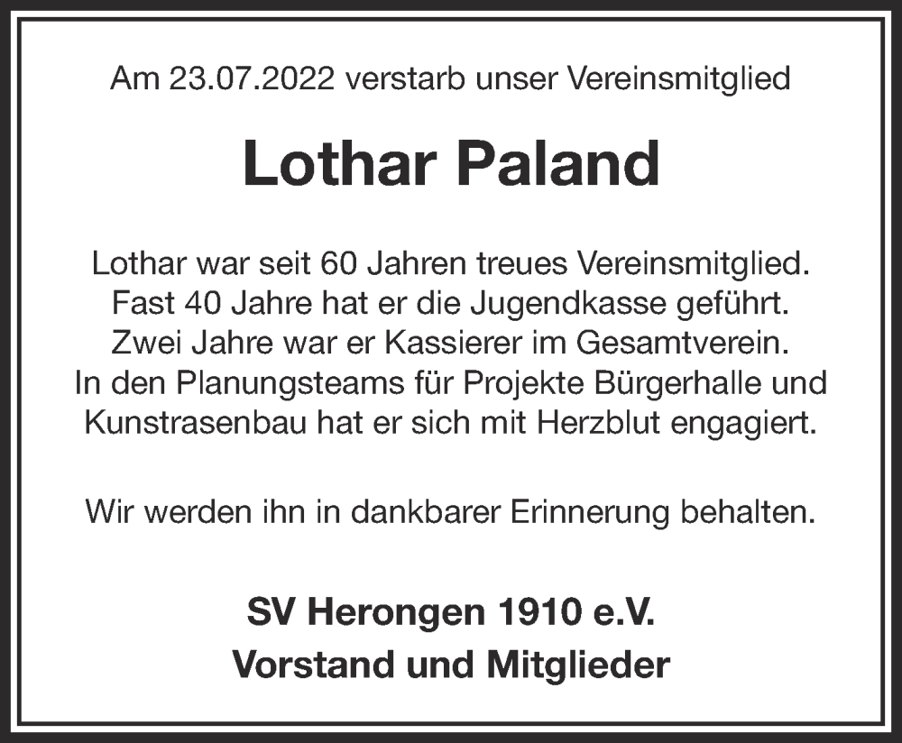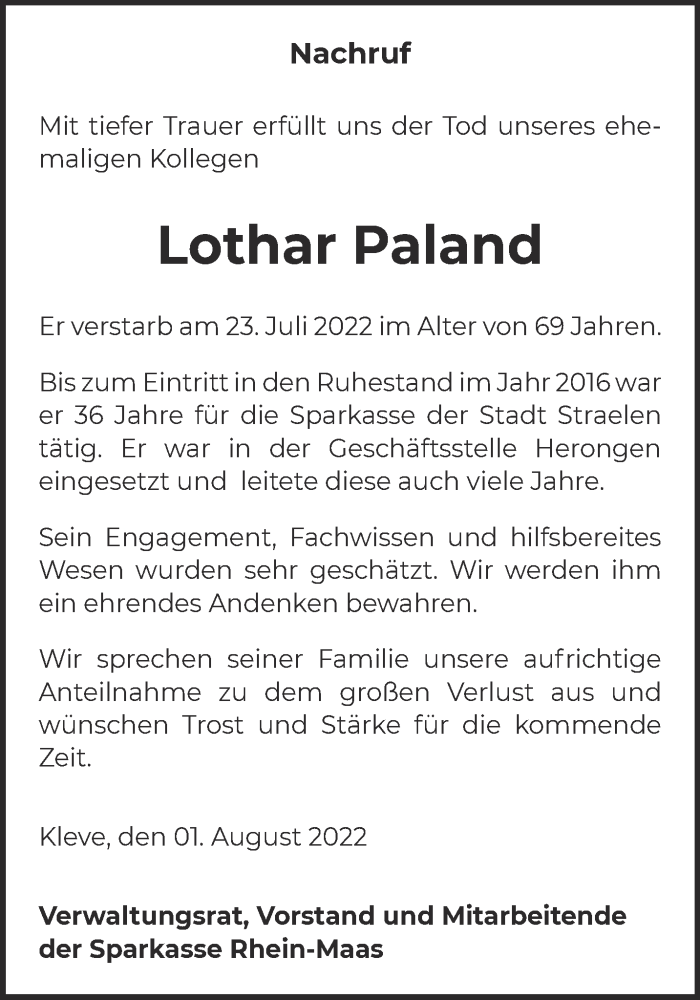 Hier finden Sie alle Traueranzeigen aus der Zeitung, die bisher für Lothar Paland erschienen sind. Weitere Traueranzeigen, die in der Zeitung erscheinen, werden hier ebenfalls aufgelistet