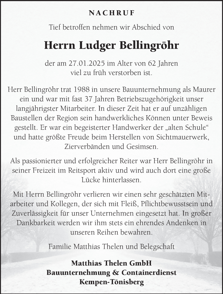 Hier finden Sie alle Traueranzeigen aus der Zeitung, die bisher für Ludger Bellingröhr erschienen sind. Weitere Traueranzeigen, die in der Zeitung erscheinen, werden hier ebenfalls aufgelistet