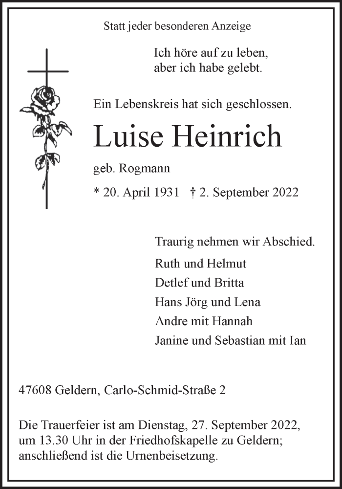 Hier finden Sie alle Traueranzeigen aus der Zeitung, die bisher für Luise Heinrich erschienen sind. Weitere Traueranzeigen, die in der Zeitung erscheinen, werden hier ebenfalls aufgelistet