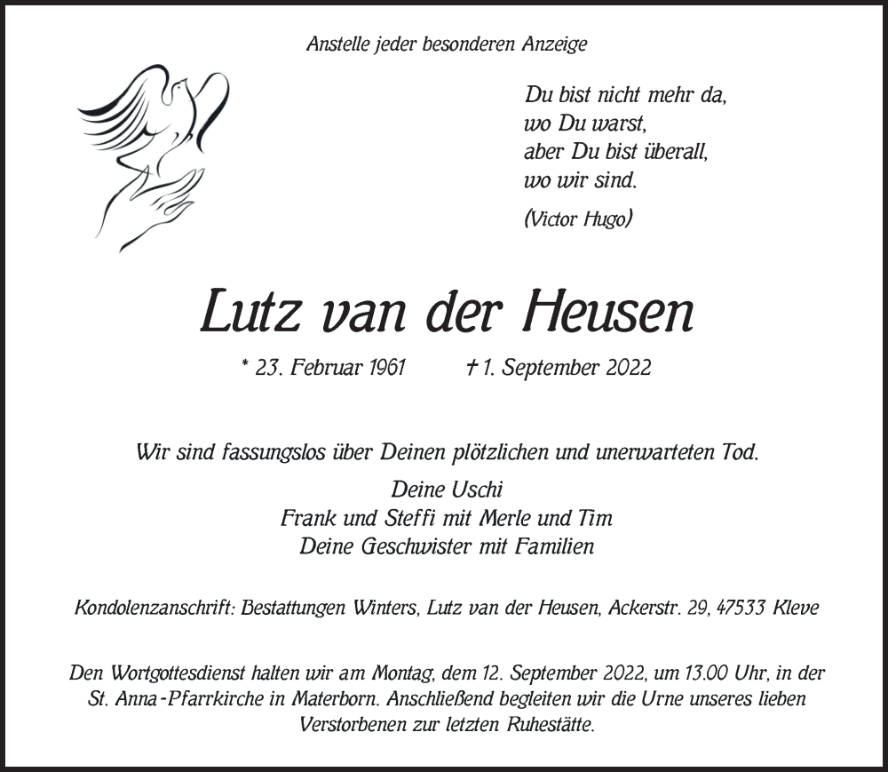 Hier finden Sie alle Traueranzeigen aus der Zeitung, die bisher für Lutz van der Heusen erschienen sind. Weitere Traueranzeigen, die in der Zeitung erscheinen, werden hier ebenfalls aufgelistet