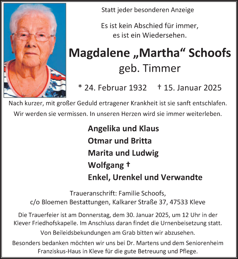 Hier finden Sie alle Traueranzeigen aus der Zeitung, die bisher für Magdalene Schoofs erschienen sind. Weitere Traueranzeigen, die in der Zeitung erscheinen, werden hier ebenfalls aufgelistet