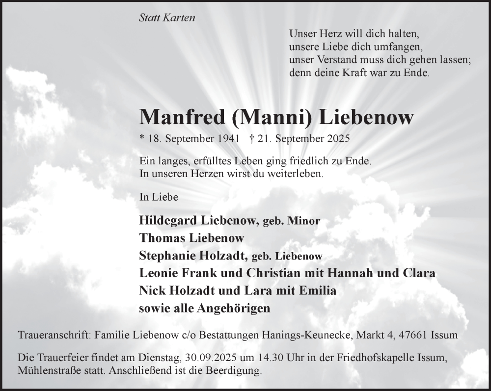 Hier finden Sie alle Traueranzeigen aus der Zeitung, die bisher für Manfred Liebenow erschienen sind. Weitere Traueranzeigen, die in der Zeitung erscheinen, werden hier ebenfalls aufgelistet