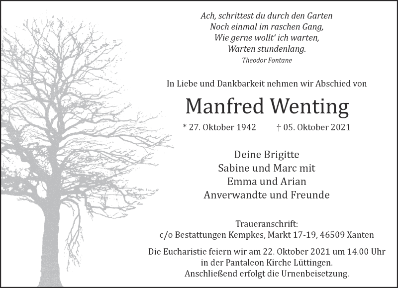 Hier finden Sie alle Traueranzeigen aus der Zeitung, die bisher für Manfred Wenting erschienen sind. Weitere Traueranzeigen, die in der Zeitung erscheinen, werden hier ebenfalls aufgelistet