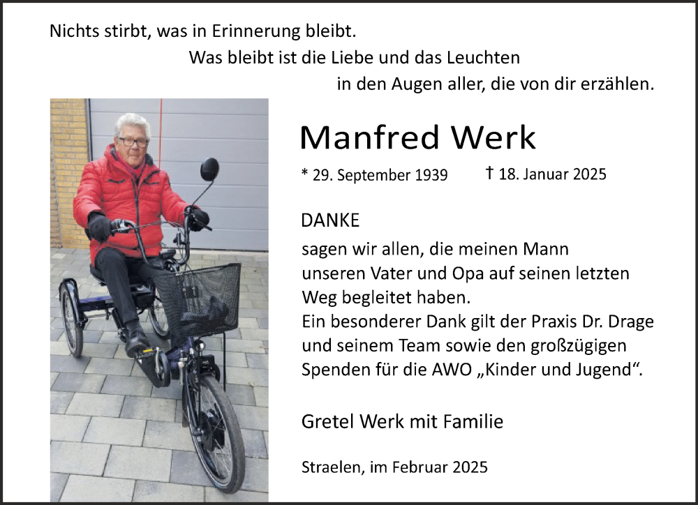 Hier finden Sie alle Traueranzeigen aus der Zeitung, die bisher für Manfred Werk erschienen sind. Weitere Traueranzeigen, die in der Zeitung erscheinen, werden hier ebenfalls aufgelistet