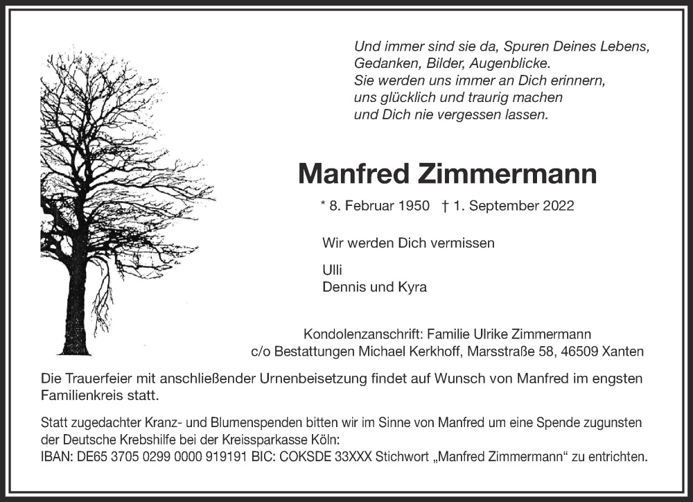 Hier finden Sie alle Traueranzeigen aus der Zeitung, die bisher für Manfred Zimmermann erschienen sind. Weitere Traueranzeigen, die in der Zeitung erscheinen, werden hier ebenfalls aufgelistet