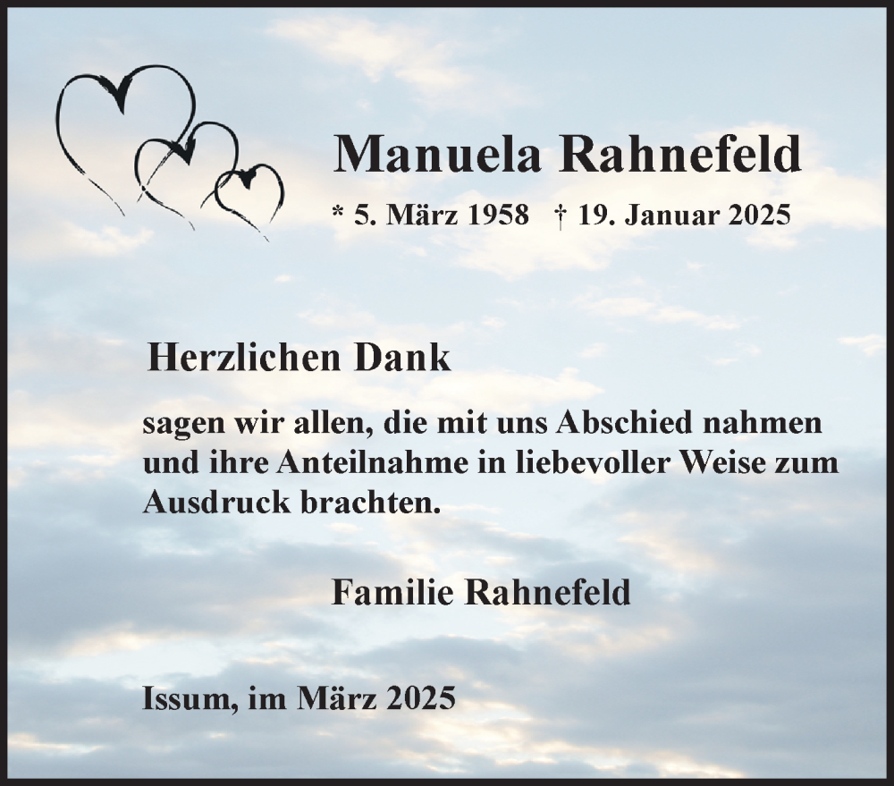 Hier finden Sie alle Traueranzeigen aus der Zeitung, die bisher für Manuela Rahnefeld erschienen sind. Weitere Traueranzeigen, die in der Zeitung erscheinen, werden hier ebenfalls aufgelistet
