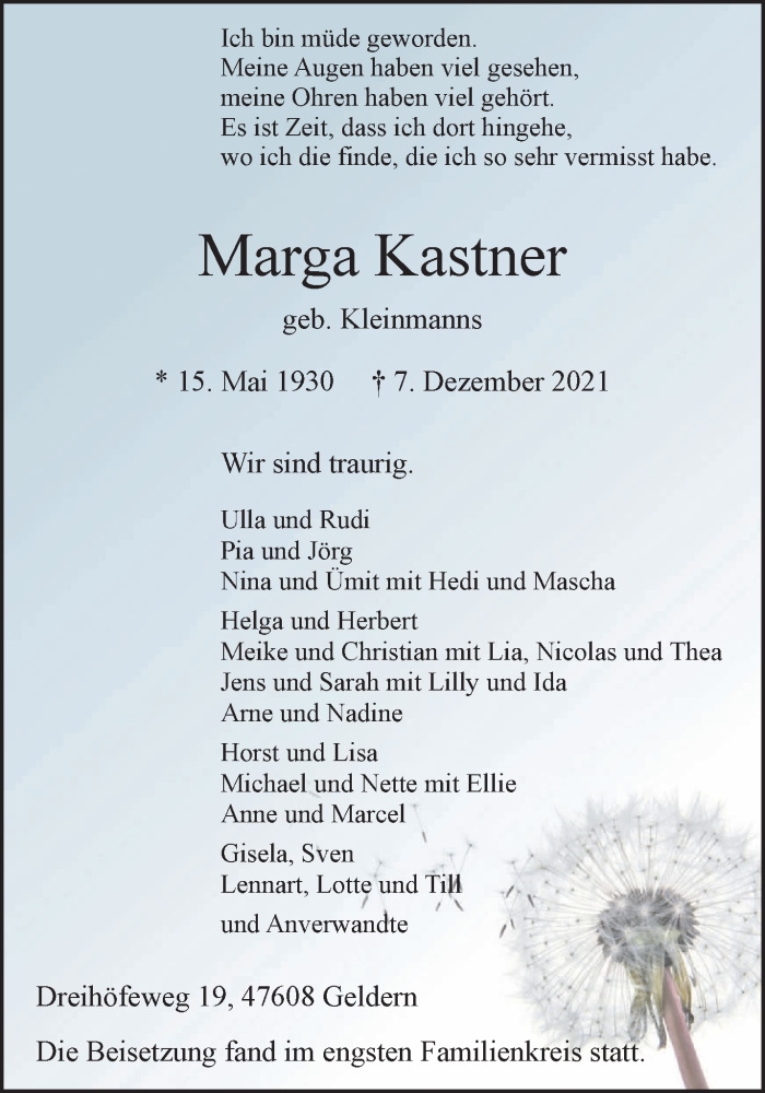 Hier finden Sie alle Traueranzeigen aus der Zeitung, die bisher für Marga Kastner erschienen sind. Weitere Traueranzeigen, die in der Zeitung erscheinen, werden hier ebenfalls aufgelistet