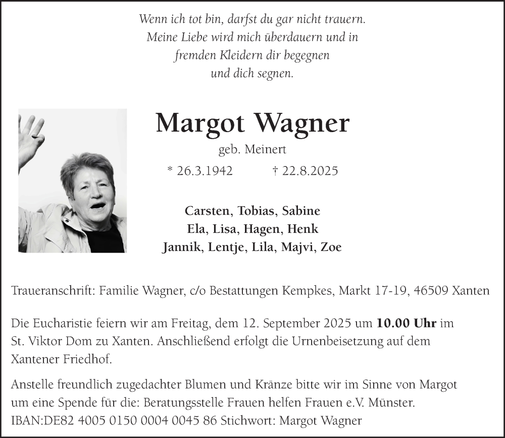 Hier finden Sie alle Traueranzeigen aus der Zeitung, die bisher für Margot Wagner erschienen sind. Weitere Traueranzeigen, die in der Zeitung erscheinen, werden hier ebenfalls aufgelistet