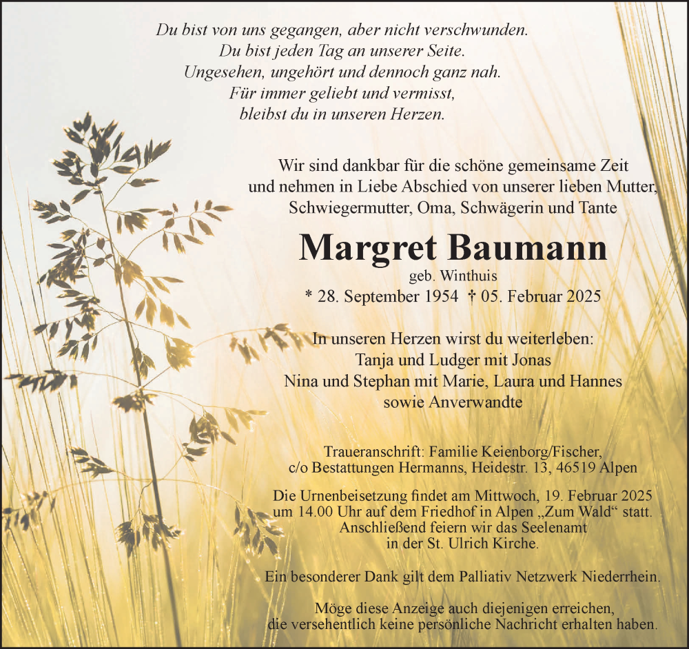 Hier finden Sie alle Traueranzeigen aus der Zeitung, die bisher für Margret Baumann erschienen sind. Weitere Traueranzeigen, die in der Zeitung erscheinen, werden hier ebenfalls aufgelistet