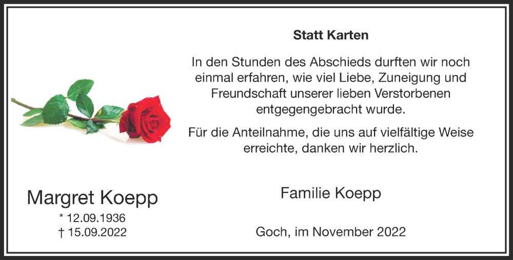 Hier finden Sie alle Traueranzeigen aus der Zeitung, die bisher für Margret Koepp erschienen sind. Weitere Traueranzeigen, die in der Zeitung erscheinen, werden hier ebenfalls aufgelistet