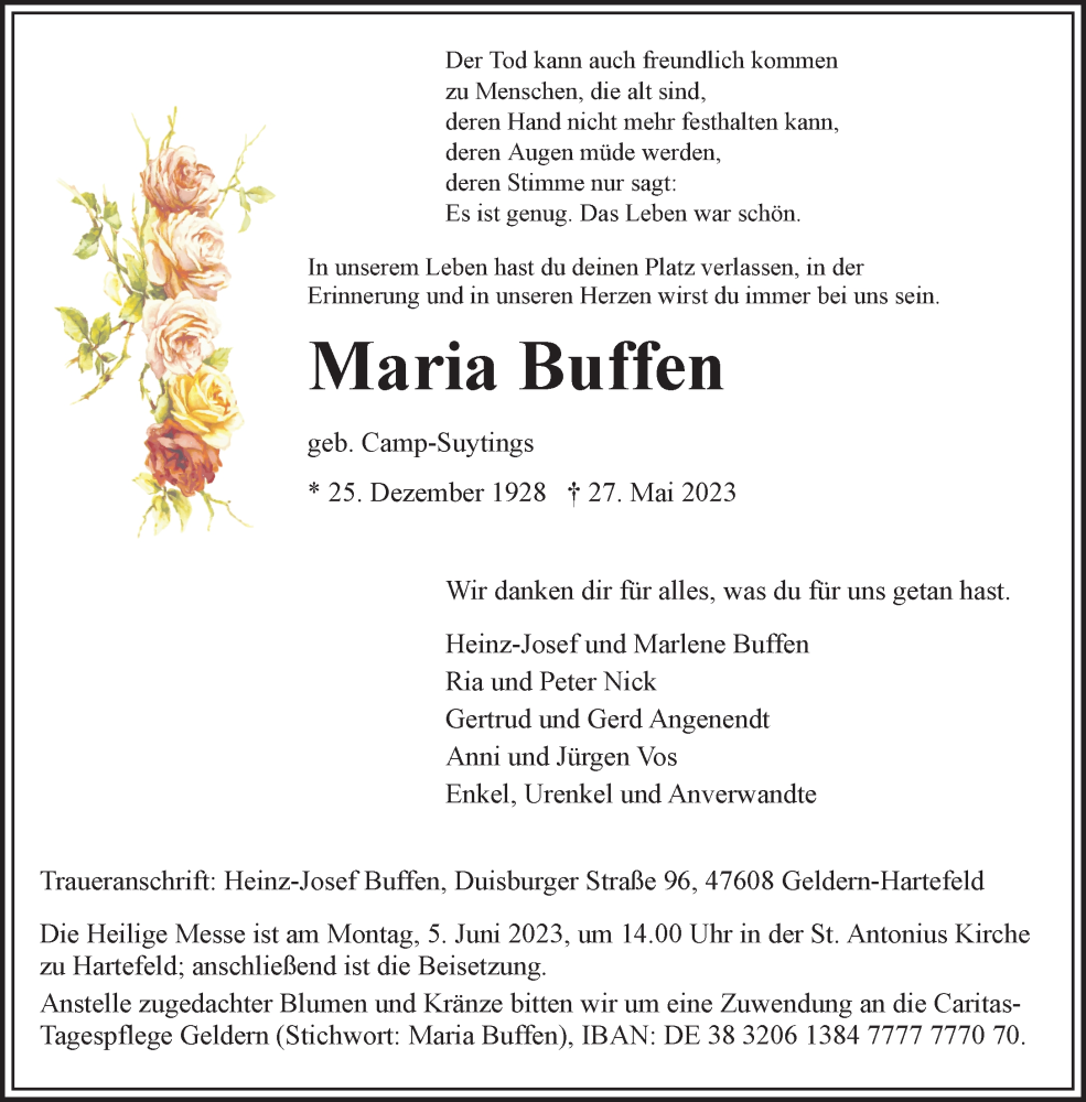 Hier finden Sie alle Traueranzeigen aus der Zeitung, die bisher für Maria Buffen erschienen sind. Weitere Traueranzeigen, die in der Zeitung erscheinen, werden hier ebenfalls aufgelistet