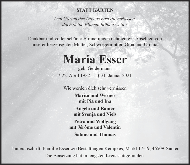 Hier finden Sie alle Traueranzeigen aus der Zeitung, die bisher für Maria Esser erschienen sind. Weitere Traueranzeigen, die in der Zeitung erscheinen, werden hier ebenfalls aufgelistet