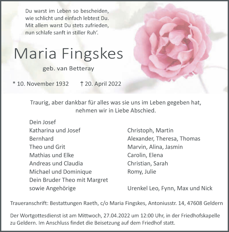 Hier finden Sie alle Traueranzeigen aus der Zeitung, die bisher für Maria Fingskes erschienen sind. Weitere Traueranzeigen, die in der Zeitung erscheinen, werden hier ebenfalls aufgelistet
