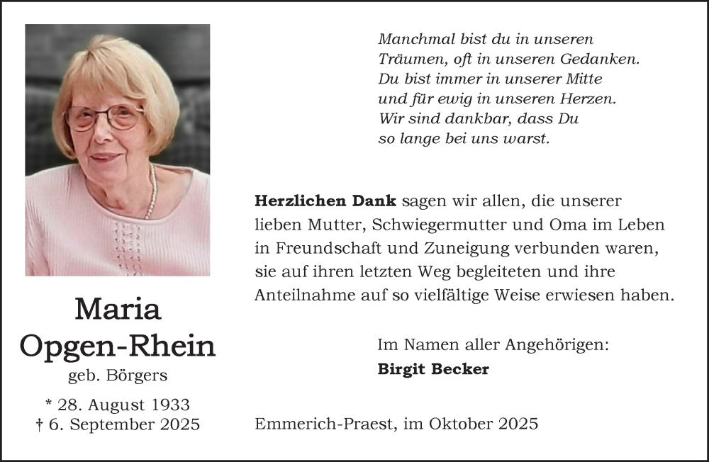 Hier finden Sie alle Traueranzeigen aus der Zeitung, die bisher für Maria Opgen-Rhein erschienen sind. Weitere Traueranzeigen, die in der Zeitung erscheinen, werden hier ebenfalls aufgelistet