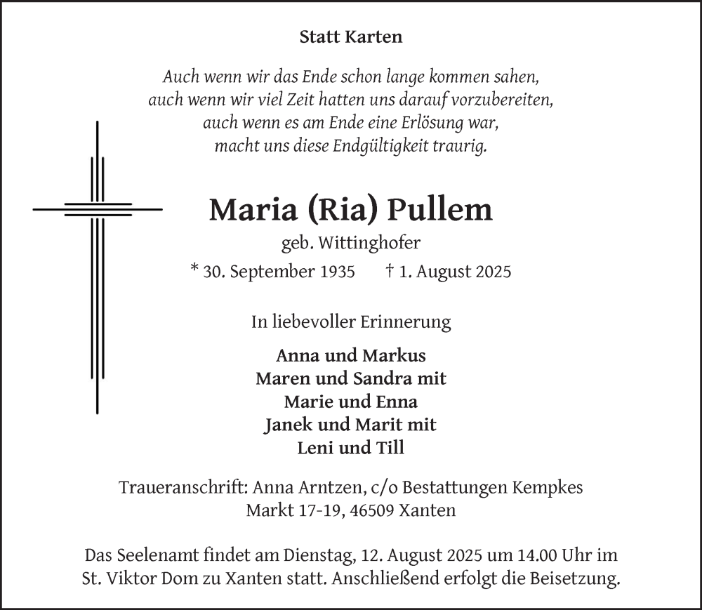 Hier finden Sie alle Traueranzeigen aus der Zeitung, die bisher für Maria Pullem erschienen sind. Weitere Traueranzeigen, die in der Zeitung erscheinen, werden hier ebenfalls aufgelistet