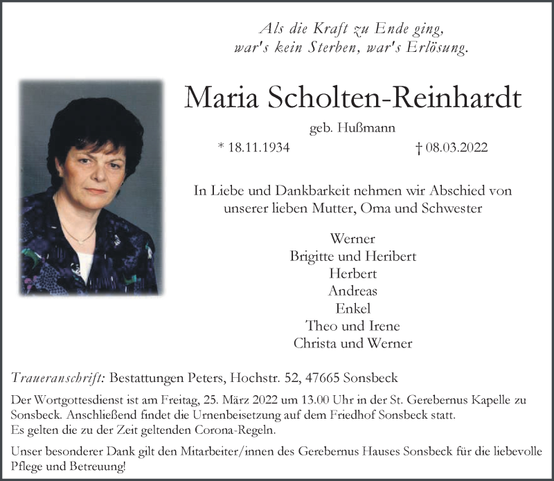 Hier finden Sie alle Traueranzeigen aus der Zeitung, die bisher für Maria Scholten-Reinhardt erschienen sind. Weitere Traueranzeigen, die in der Zeitung erscheinen, werden hier ebenfalls aufgelistet