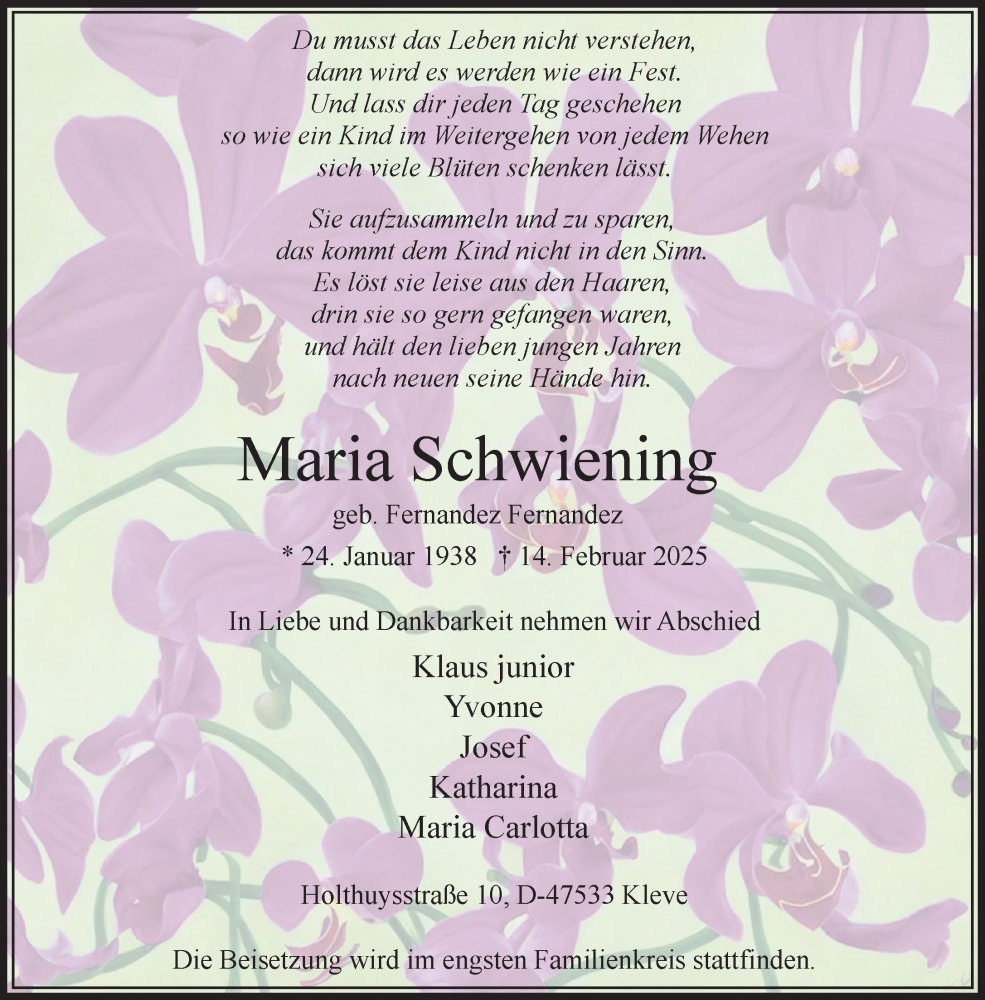 Hier finden Sie alle Traueranzeigen aus der Zeitung, die bisher für Maria Schwiening erschienen sind. Weitere Traueranzeigen, die in der Zeitung erscheinen, werden hier ebenfalls aufgelistet