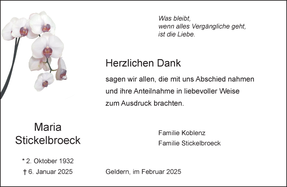 Hier finden Sie alle Traueranzeigen aus der Zeitung, die bisher für Maria Stickelbroeck erschienen sind. Weitere Traueranzeigen, die in der Zeitung erscheinen, werden hier ebenfalls aufgelistet