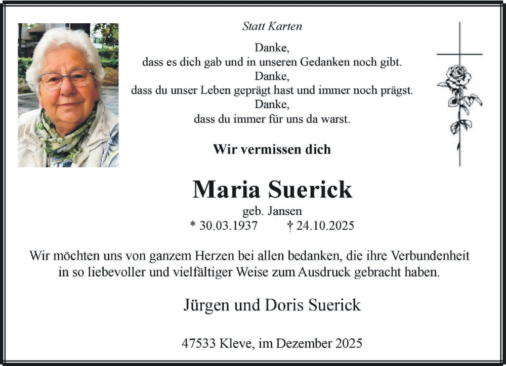 Hier finden Sie alle Traueranzeigen aus der Zeitung, die bisher für Maria Suerick erschienen sind. Weitere Traueranzeigen, die in der Zeitung erscheinen, werden hier ebenfalls aufgelistet