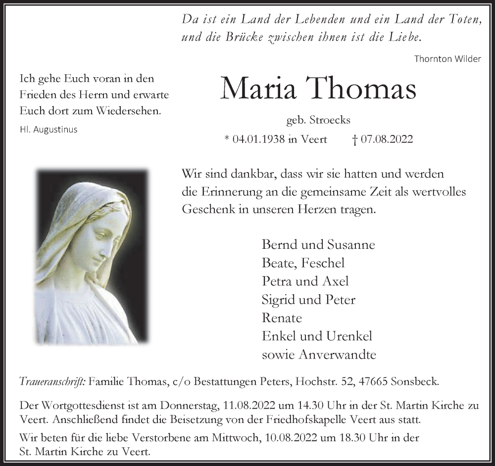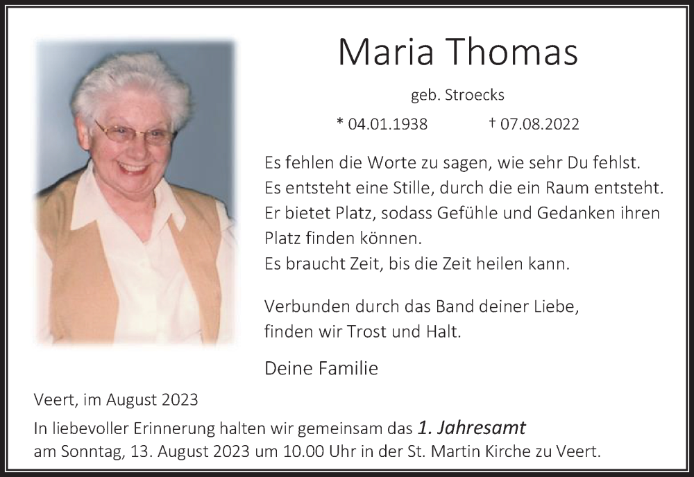 Hier finden Sie alle Traueranzeigen aus der Zeitung, die bisher für Maria Thomas erschienen sind. Weitere Traueranzeigen, die in der Zeitung erscheinen, werden hier ebenfalls aufgelistet