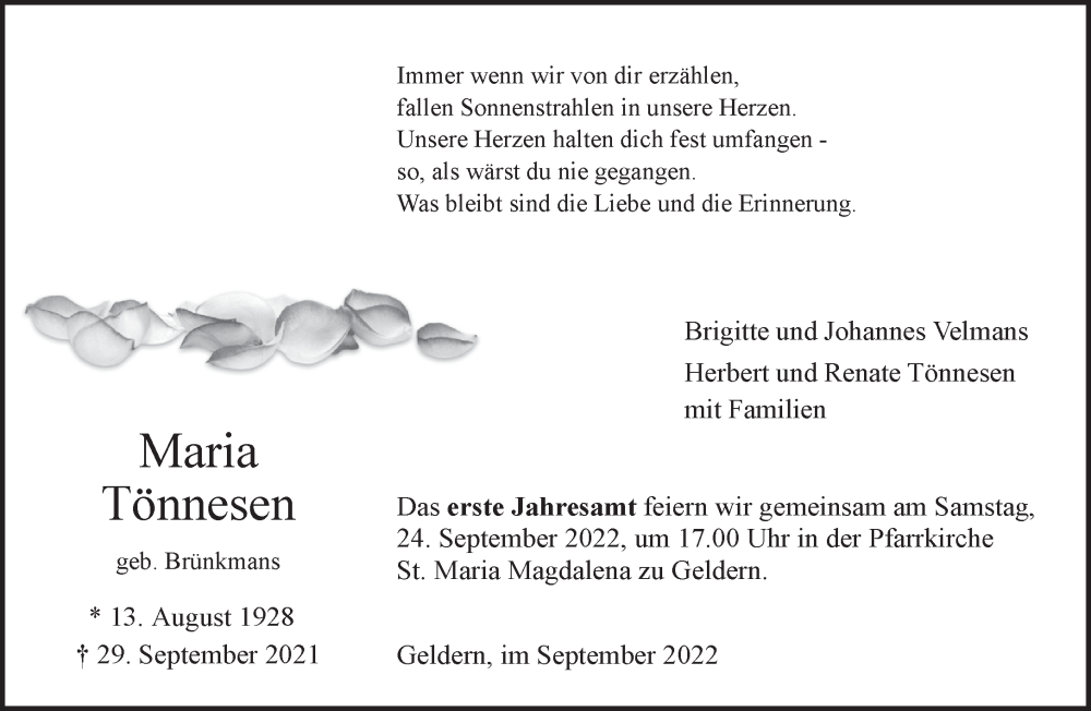 Hier finden Sie alle Traueranzeigen aus der Zeitung, die bisher für Maria Tönnesen erschienen sind. Weitere Traueranzeigen, die in der Zeitung erscheinen, werden hier ebenfalls aufgelistet
