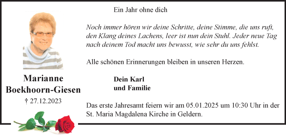 Hier finden Sie alle Traueranzeigen aus der Zeitung, die bisher für Marianne Boekhoorn-Giesen erschienen sind. Weitere Traueranzeigen, die in der Zeitung erscheinen, werden hier ebenfalls aufgelistet
