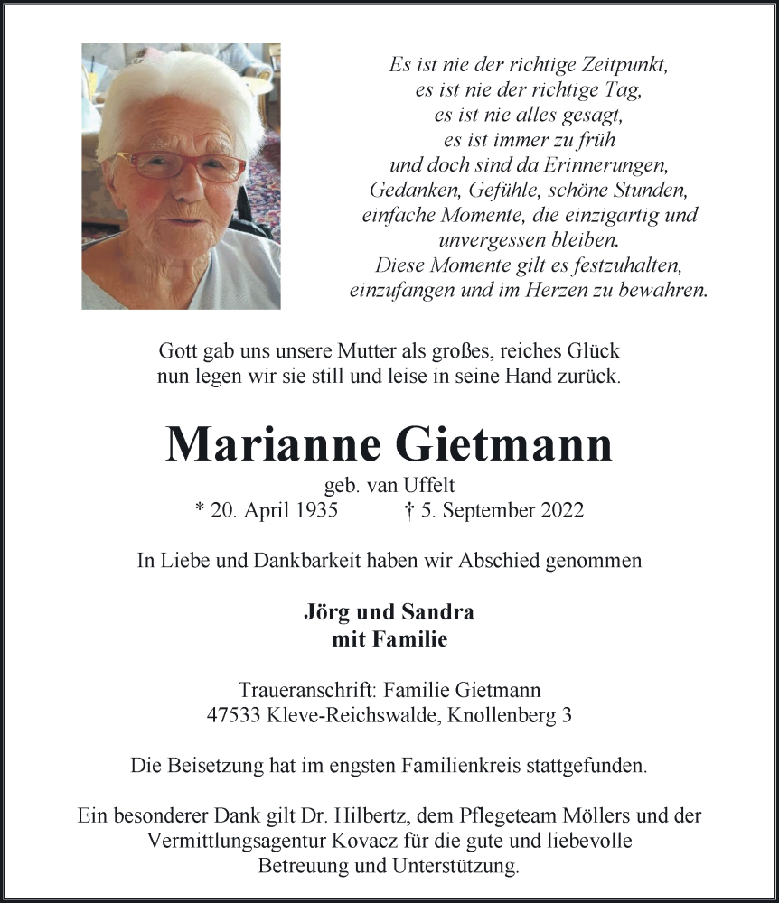 Hier finden Sie alle Traueranzeigen aus der Zeitung, die bisher für Marianne Gietmann erschienen sind. Weitere Traueranzeigen, die in der Zeitung erscheinen, werden hier ebenfalls aufgelistet