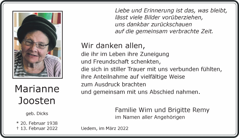 Hier finden Sie alle Traueranzeigen aus der Zeitung, die bisher für Marianne Joosten erschienen sind. Weitere Traueranzeigen, die in der Zeitung erscheinen, werden hier ebenfalls aufgelistet