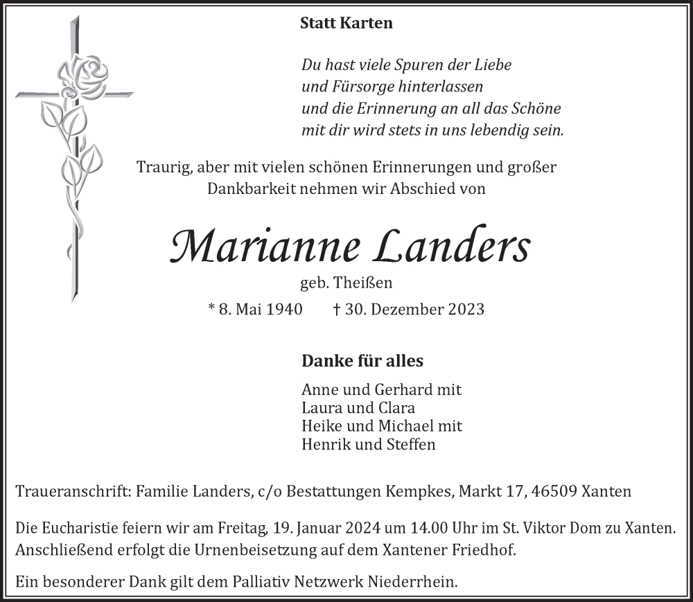 Hier finden Sie alle Traueranzeigen aus der Zeitung, die bisher für Marianne Landers erschienen sind. Weitere Traueranzeigen, die in der Zeitung erscheinen, werden hier ebenfalls aufgelistet