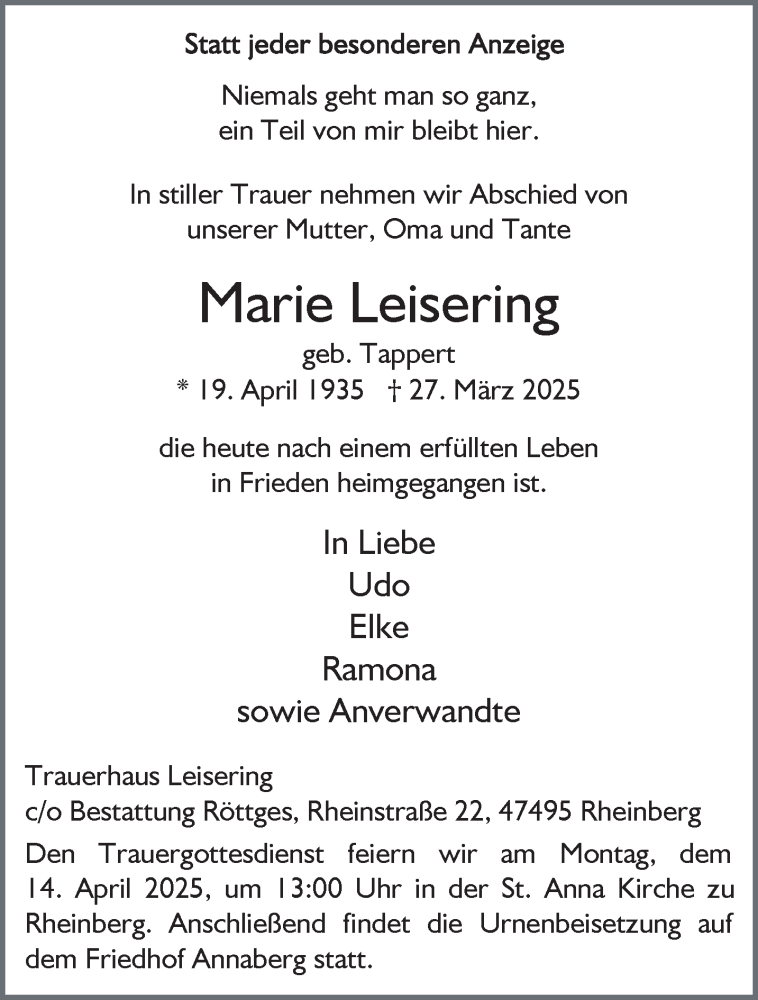 Hier finden Sie alle Traueranzeigen aus der Zeitung, die bisher für Marie Leisering erschienen sind. Weitere Traueranzeigen, die in der Zeitung erscheinen, werden hier ebenfalls aufgelistet