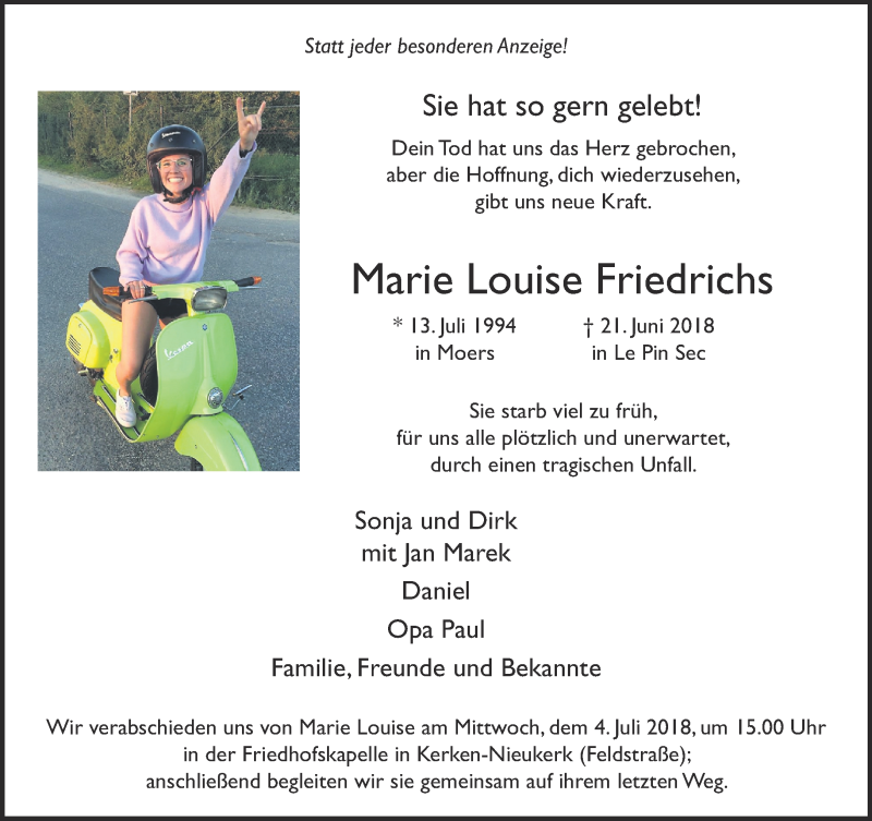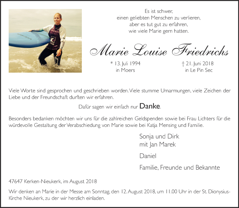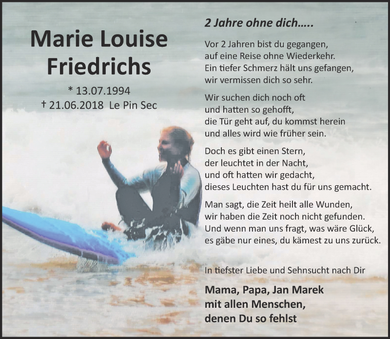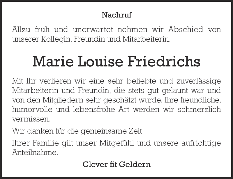 Hier finden Sie alle Traueranzeigen aus der Zeitung, die bisher für Marie Louise Friedrichs erschienen sind. Weitere Traueranzeigen, die in der Zeitung erscheinen, werden hier ebenfalls aufgelistet